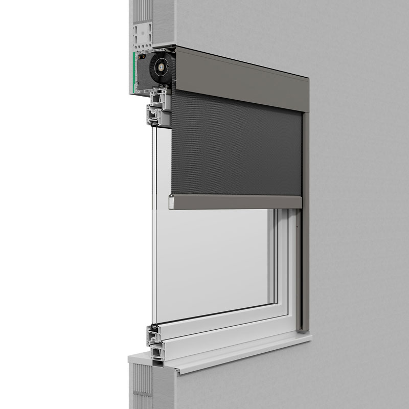 Das Textilscreens-Aufsatzsystem aus Kunststoff. Optional mit außenliegenden Putzträgern oder Aluminiumaußenblende. Die Kastenteile zum Rauminneren bestehen aus einer doppelten Hohlkammer und sorgen somit für Stabilität, Isolierfähigkeit und hohe Schallschutzwerte. Da das System komplett mit den Fenstern ausgeliefert und montiert wird, entstehen nicht nur wesentliche Vorteile in Planung und Umsetzung, sondern auch im Wärmeschutz. Durch die wärmedämmende Einheit von Fenster und Textilscreen kann wertvolle Energie gespart werden und damit bares Geld.